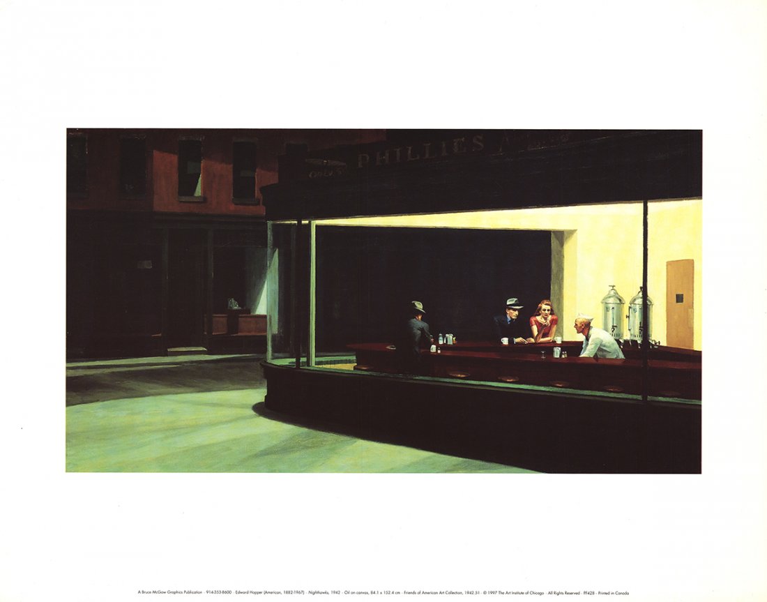 Walter Rane (OR,CA,b 1949) oil paintingApr 12, 2026After Van Gogh Acrylic On Canvas "Cafe Terrace At Night"1 day LeftAndre Renoux Interior Van Gogh Hand Signed Serigraph Photorealism3 days LeftAfter Van Gogh Acrylic On Canvas "Cafe Terrace At Night"1 day LeftEDWARD HOPPER 'NIGHTHAWKS' LITHOGRAPHFeb 28, 2026Nighthawks, 1942 Canvas Reproduction – 30" × 15"Mar 06, 2026Edward Hopper - NighthawksMar 01, 2026Edward Hopper - Nighthawks - Serigraph on Photo paperMar 08, 2026EDWARD HOPPER 'CONFERENCE AT NIGHT' LITHOGRAPHFeb 28, 2026Edward Hopper - Chop SueyMar 01, 2026EDWARD HOPPER 'EARLY SUNDAY MORNING' LITHOGRAPHFeb 28, 2026Death NYC Edward Hopper Taylor SwiftRealism EDWARD HOPPER First Row Orchestra 27.5" x 39.5" Offset Lithograph 19975 days Left"The House by the Railroad" (1925) – Wall Art Reproduction by Edward HopperMar 17, 2026Still Life Painting of American Diner Interior New York City by British Artist, 2019Richard Estes, Danbury Tile (from the Urban Landscapes I portfolio)5 days Left