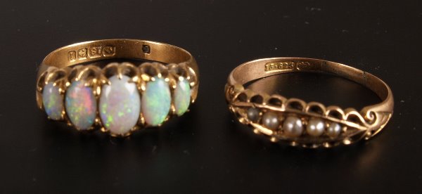 Edwardian 18ct gold five stone opal half hoop ring,