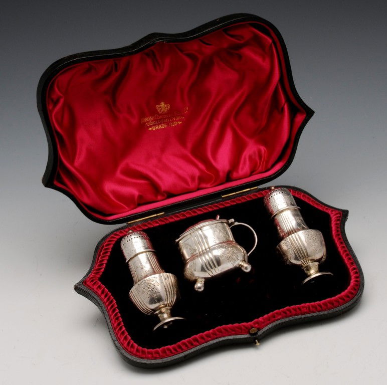 Edwardian cased three piece silver condiment set.
