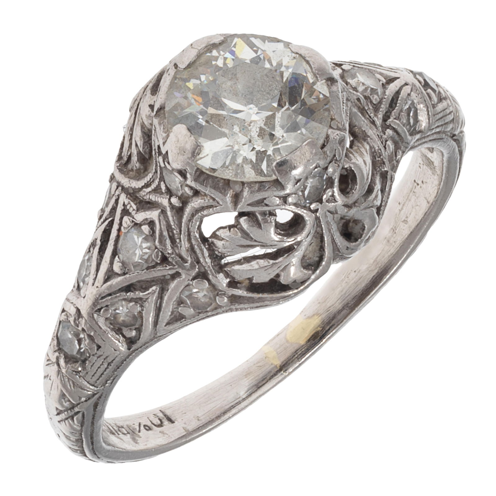 SoldPLATINUM DIAMOND EDWARDIAN RING.The center approx. 1/2 ct old European cut estimated L color and SI clarity, flanked by 2 diamonds approx .40 ctw of K color and SI2 clarity, with a filigree design setting set with many single cut diSee Sold Price