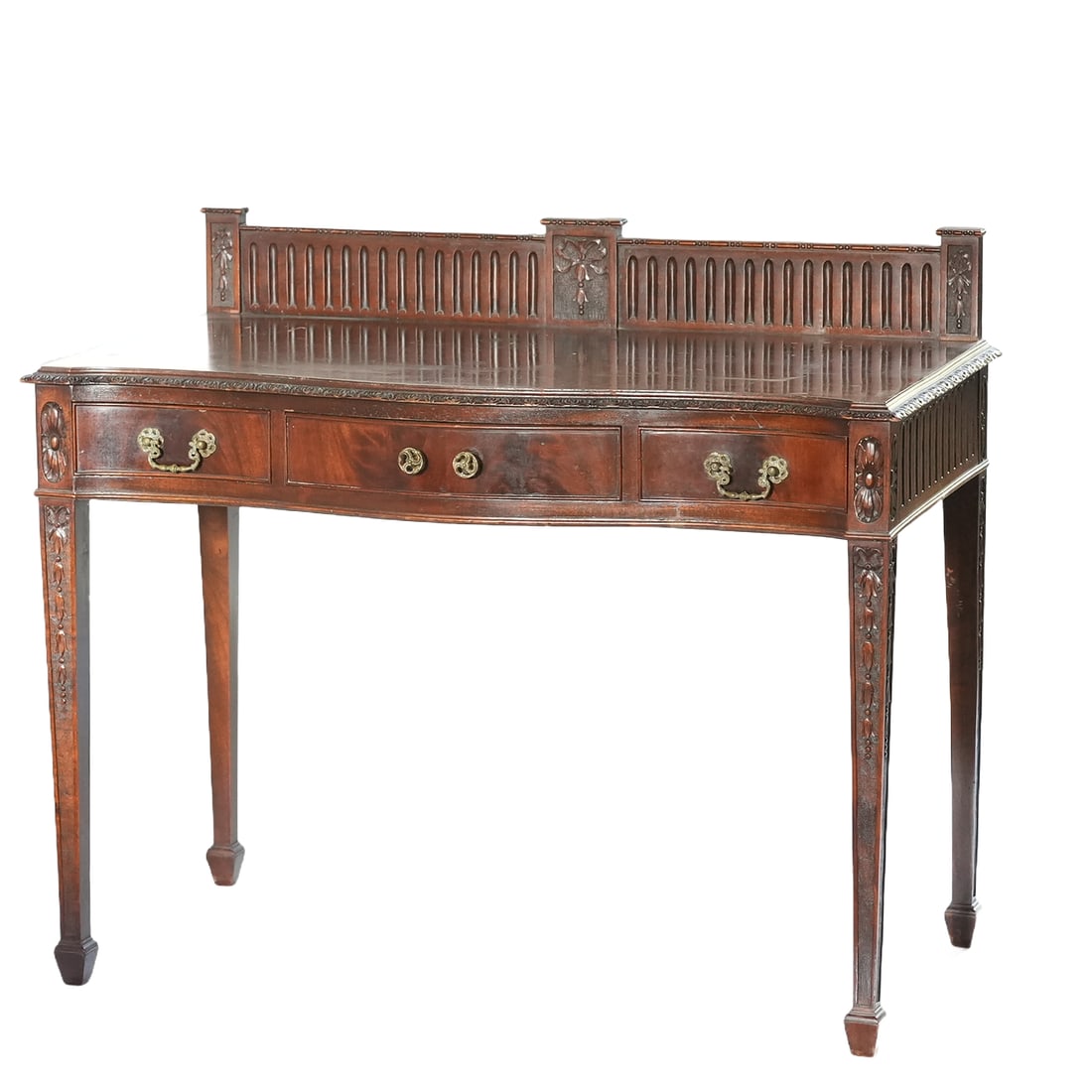 SoldGeorge III Mahogany Lady's Dressing TableGeorge III Mahogany Lady's Dressing Tablecirca 1800, oak secondary, long upper drawer above two small drawers, with relief carved and shaped skirt, square straight legs with inside chamfer. 26 x 29 xSee Sold Price