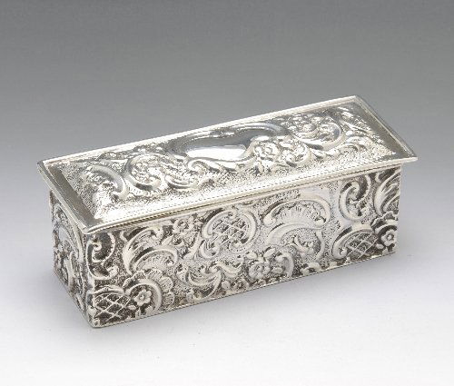 A VICTORIAN SILVER SHAPED RECTANGULAR SNUFF BOXFeb 17, 2026AN EDWARDIAN SILVER GLOVE BOXFeb 17, 2026An Antique Sterling Silver Jewelry BoxFeb 12, 2026A VICTORIAN SILVER BOX. Birmingham 1899. 88 grams. 12.5 cm long.Feb 12, 2026DERBY AND HORSE RACING INTEREST: a good silver box D & J Wellby, London 1916AN EDWARDIAN RECTANGULAR SILVER TABLE BOXFeb 17, 2026Tiffany & Co. Silver-Soldered Stamp Box and Cover.4 days LeftAntique Sterling Silver Cigarette Box, Birmingham, Early 1900sFeb 19, 2026George V Silver Trinket Box, Mark of George Nathan and Ridley HayesFeb 12, 2026A SILVER TABLE BOXFeb 17, 2026A LATE 19TH CENTURY JAPANESE MEIJI PERIOD SILVER BOX AND COVER engraved with flowers. 70 grams. 8.55 days LeftGerman 750 Silver Vinaigrette Box Kecker Before 1886Feb 22, 2026A SWEDISH SILVER RECTANGULAR TABLE BOXFeb 17, 2026THAI REPOUSSÉ STERLING SILVER HUMIDOR BOX 685 GRAMS4 days LeftVictorian Silver-Plated Biscuit BoxFeb 12, 2026Austro-Hungarian .800 Silver Cigarette Box1 day Left
