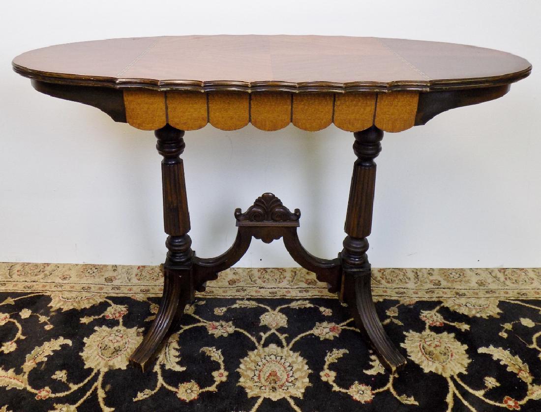 A REGENCY STYLE STRING-INLAID AND CROSS BANDED MAHOGANY SOFA TABLE, with inverted serpentine-frontedA REGENCY STYLE STRING-INLAID AND CROSS BANDED MAHOGANY SOFA TABLE, with inverted serpentine-fronted top above three frieze drawers, raised on pillar ends joined by a turned stretcher, continuing to m