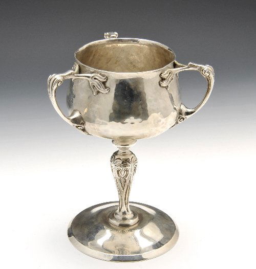 SoldRedlich & Co., Three-handled trophy cupRedlich & Co. Three-handled trophy cup New York, USA, c. 1900sterling silver 11.625 h x 11.25 w x 10.25 d in (30 x 29 x 26 cm) The three-handled trophy cup was retailed by Spaulding & Co. of CSee Sold Price
