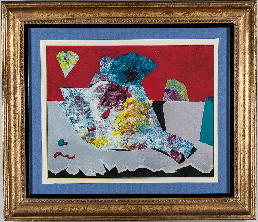 SoldEvgeny Esaulenko ( Russian 1942/1994) PaintingYEVGENY ESAULENKO (RUSSIAN 1942-1994) Fish, 1980 Oil and collage on board .signed and dated upper right image: 29.21 x 36.83 cm (11 ½ x 14 ½ in.),overall: 87.63 x 66.04 cm (34 ½ xSee Sold Price