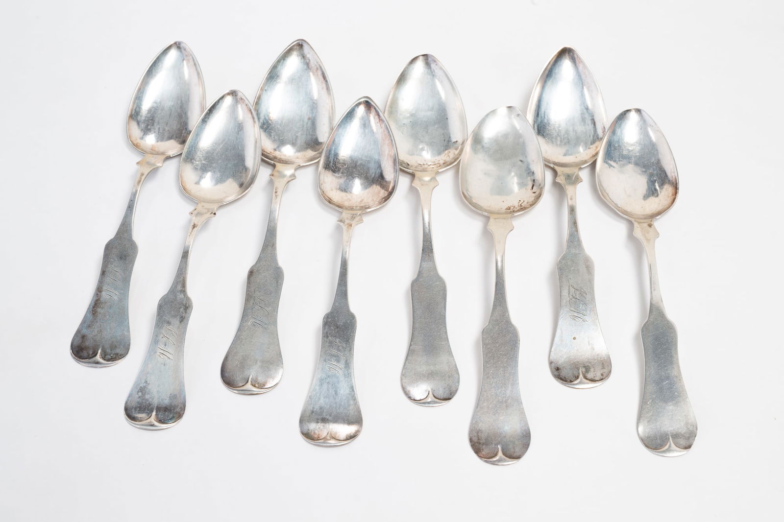 EIGHT CINCINNATI COIN SILVER TABLESPOONS SIGNED E & D KINSEY.