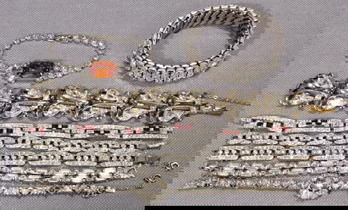 SoldSilver Colored Diamond Themed JewelrySilver Colored Diamond Themed Jewelry This jewelry is assorted faux diamond necklaces and bracelets. These are in fair condition, there is a broken clasp on one piece and an incomplete earring pair inSee Sold Price