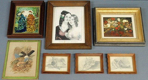 Eight framed items- Currier print, tinsel work, dr