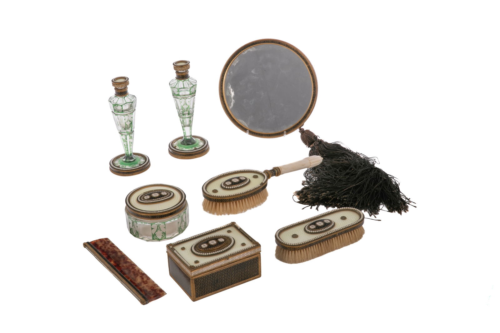 EIGHT PIECE BRASS & ENAMEL VANITY SET