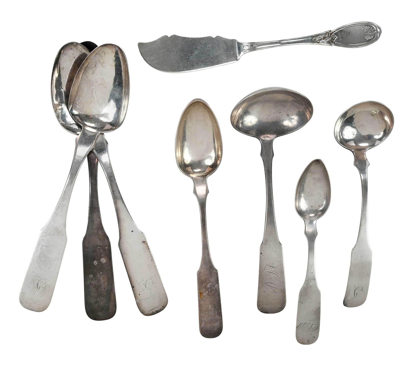 Lot 8 Silver Plated Serving Utensils ITALY+6 days Left11-piece Lot18 hrs LeftMixed Vintage Silverplate Flatware Lot Community Plate NCO Victor3 days LeftLot of (10) American Coin Silver SpoonsApr 26, 2026(12) STERLING SILVER FLATWARE & STRAINER, TIFFANY & CO., GORHAM & MOREMar 29, 2026Twenty-Five Pieces of British Sterling Flatware, 18th/19th/20th c., App. Total Sterling Wt.- 18.83Mar 27, 2026Twenty-Two Piece Group of American Coin Silver Flatware, 18th/19th c., App. Total Coin Silver Wt.-Mar 27, 202623 pcs. Early American Coin and Sterling Flatware21 hrs LeftEarly American Coin Silver "Fiddle Back" Flatware and Extras (15)Mar 28, 20269 pcs. Sterling and Coin Silver Flatware21 hrs LeftThirty-Six Piece Group of American Sterling Flatware, 19th/20th c., App. Total Sterling Wt.- 24.28Mar 27, 2026An assembled twenty nine piece group of International silver flatware, 20th centuryApr 01, 2026An assembled forty six piece American silver flatware service, 19th-20th centuryApr 01, 2026International Sterling Silver "Wild Rose" Flatware 686 GramsMar 28, 2026Dublin 1796, no maker’s mark A George III Irish sterling silver butter knife13 PIECES OF STERLING SILVER AND PLATED FLATWARE6 days Left