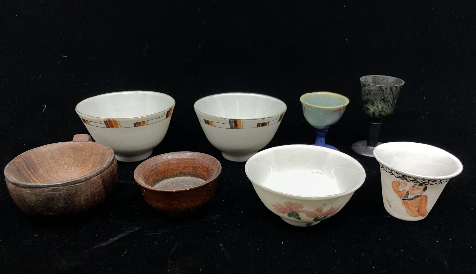 Eight wooden/jade/porcelain cups