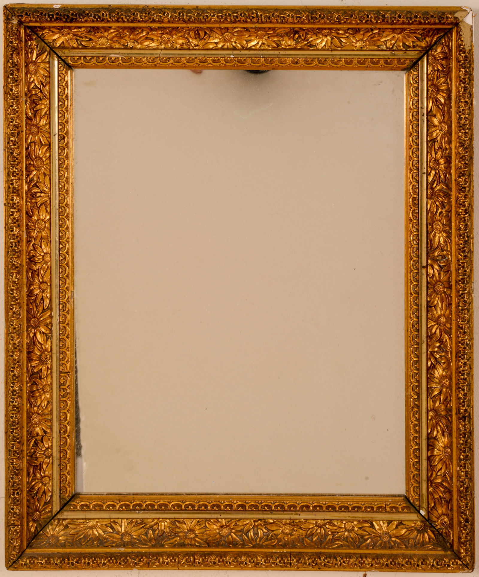 SoldELABORATE GOLD FRAMED MIRRORFrame carved with daisies, 17.75 inches x 14.5 inches, frame with some missing moldingSee Sold Price