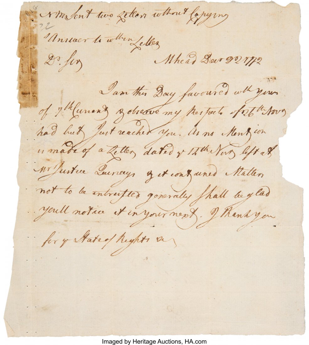 George Washington Autograph Letter Signed. One p3 days LeftAlexander Hamilton Letter Signed. Two pages, 7 13 days Left1763 Signed Legal Opinion Bank of England Probate DocumentMar 15, 2026Revolutionary War Soldier's Letter by Elisha Abb3 days Left1769 Colonial Land Transfer Deed (Bridgewater, MA)Mar 15, 20261773 Colonial Court Indictment The King vs. McGile, Signed by Attorney General Andrew AllenMar 15, 2026Robert Morris 1796 Signature Signer of Declaration Financial Receipt DocumentMar 29, 20261789 Early American Handwritten Land DeedMar 15, 20261779 Revolutionary War Pennsylvania Court DocumentMar 15, 20261798 Jared Ingersoll, Constitution Signer DocumentMar 15, 20261793 Justin Foote ALS to NY Senator Ebenezer FooteMar 15, 20261781 William Bradford Revolutionary War Pennsylvania DocumentMar 15, 20261728 Colonial Land Promissory Note Early American ManuscriptMar 15, 2026Declaration Signer George Wythe Document Signed.3 days LeftDeclaration Signer William Floyd Autograph Lette3 days Left1794 Connecticut Recorded Land DeedMar 15, 2026
