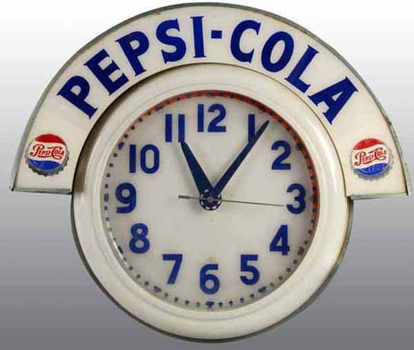 SoldPepsi Cola Double Bubble Advertising Clock.Circa 1950. Very clean example with some scrapes on the back side. It retains the original Advertising Products label on the back. Clock is in working order. Condition(Excellent).Dimensions16" Dia.See Sold Price