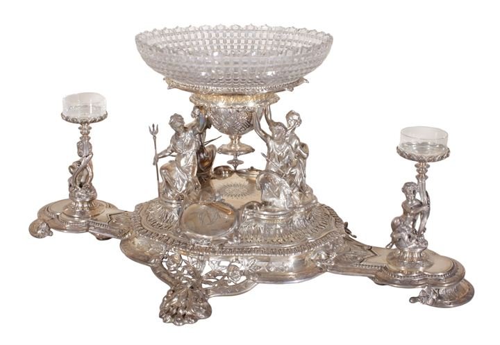 SoldImpressive Elkington Silverplate CenterpieceImpressive Victorian Elkington Silverplate Centerpiece 1861, Elkington, Mason & Co., Birmingham, in the form of a sprawling oak tree with six scrolling branches, each terminating in a candle nozzle anSee Sold Price