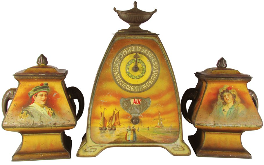 LOT OF BISCUIT AND CHOCOLATE TINSFeb 26, 2026LOT OF TIN LITHO ADVERTISING TINSFeb 26, 2026LOT OF CAST IRON STILL BANKSFeb 26, 2026LOT OF BRASS KEROSENE LAMP BASESFeb 26, 2026(4) PAINTED TOLE TEA CANISTERS, 2 NOW FASHIONED AS TABLE LAMPS5 days Left(3) SEVRES STYLE PORCELAIN & BRONZE MANTEL CLOCK & CANDELABRA GARNITURE SET6 days LeftLARGE ANTIQUE SPICE STORAGE CONTAINERS 1.3LB EA--3Mar 08, 2026Russian Kholuy Lacquer Fairy Tale Jewelry BoxFeb 26, 2026(3) Time Lock Safe Tin Bank's with Dog GraphicsMar 01, 2026(3) VINTAGE ADVERTISING TINSFeb 26, 2026Dutch silver miniature tall case clock.Feb 24, 2026Antique French Sevres Porcelain & Dore Bronze Three Pcs Clock & Matching Candelabras Set6 days LeftRoyal Vienna Style Gilt Porcelain ClockFeb 26, 2026United Wilson JUWC Porcelain Urn, Vase & Jar, c 1900Feb 25, 2026EUROPEAN TIN GLAZE FAIENCE CLOCK WITH CANDELABRA SET3 days LeftTwo Vintage Fruit-Decorated Tin BoxesFeb 28, 2026