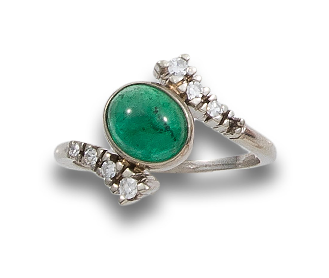 EMERALD CABOCHON RING, DIAMONDS, IN WHITE GOLD