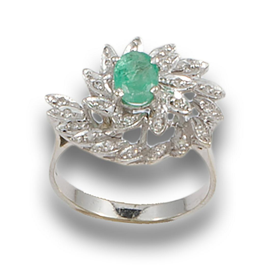 EMERALD, DIAMONDS AND WHITE GOLD FLOWER RING