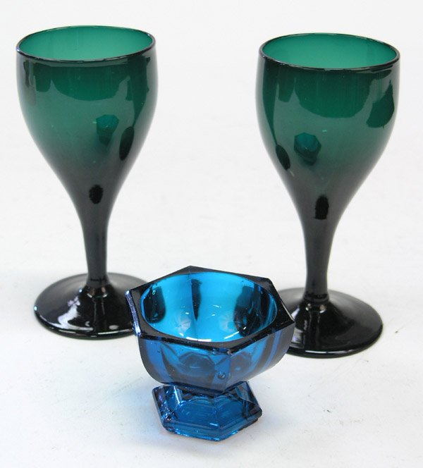 SoldFREE-BLOWN WINES, LOT OF 11FREE-BLOWN WINES, LOT OF 11, various shades of glass ranging from emerald green to teal, each example having conical bowls raised on applied button knop stems and with applied sloping feet,See Sold Price