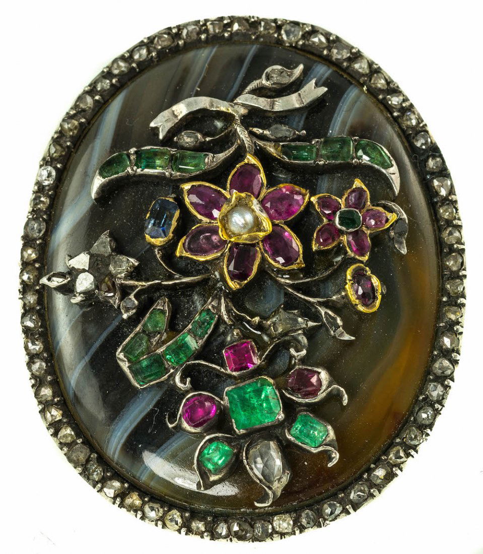 EMERALD, RUBY AGATE AND DIAMOND BROOCH