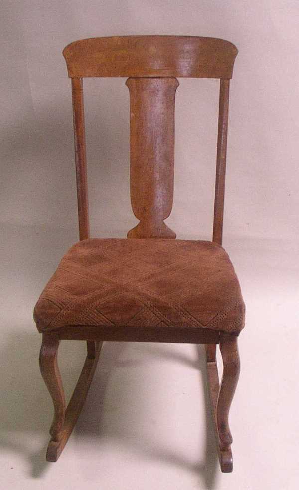 SoldMixed wood ladder back rocker w/slat seatMixed wood ladder back rocker with slat seat made from 2 different woods and dated with patent date of May 14, 1878, stained cherry, 38"H to top of finials, seat is 19"W x 14"DSee Sold Price