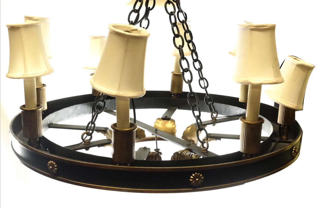 SoldEmpire-Style 8-Light FixtureBronze black and gold patina 8-light circular chandelier. [26" Dia x 12" H]. Dimensions: 26.00 " ⌀ x 12.00 " H; See Sold Price