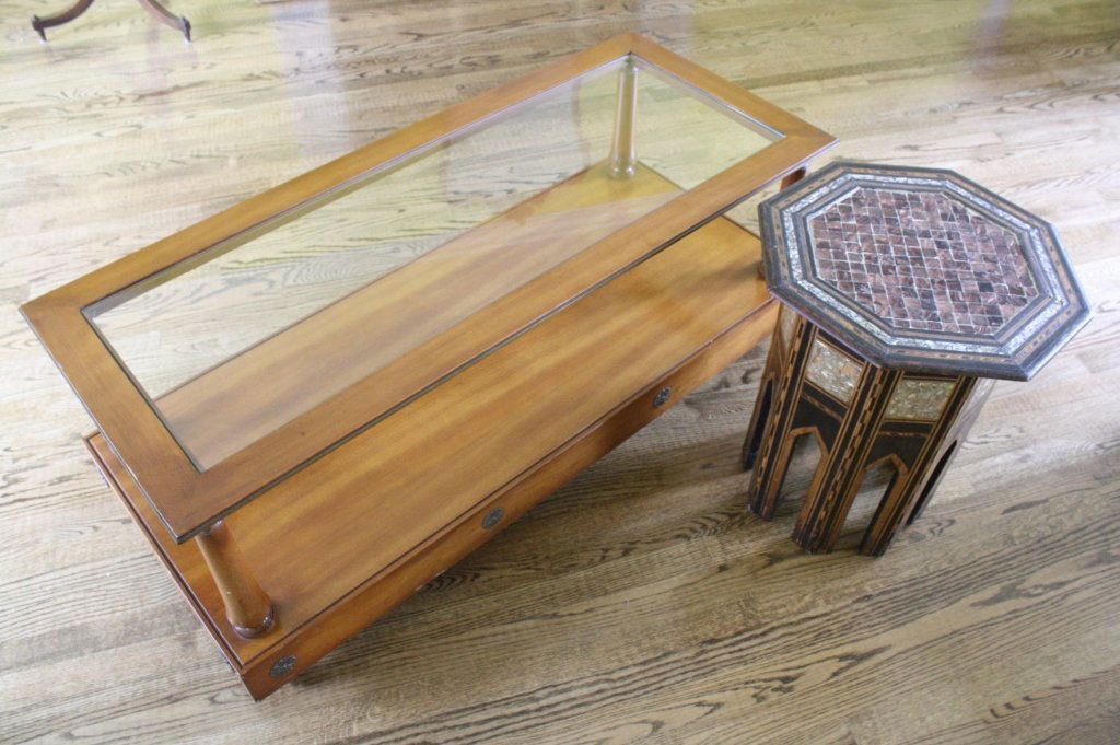 SoldEmpire Style Coffee Table and Mosaic End TableTwo level with Glass Top and with brass rosette decor around base. In good condition. Measures 45 L by 19 W and 18 H. Side Indian style octagonal end table with mother of pearl inlays. Measures 17 W bSee Sold Price