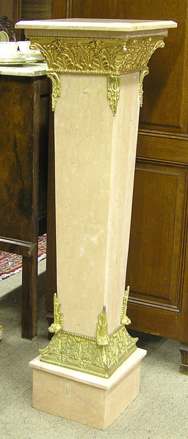 SoldFrench Empire Style and Marble PedestalA French Empire Style and Marble Pedestal, 20th Century, With ormolu mounts. H: 41 D: 16 1/2 in. From the Estate of Robert J. Jergens. Proceeds to benefit the Cleveland Institute of Art Scholarship FuSee Sold Price