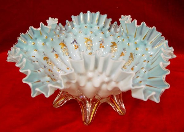 ENAMEL DECORATED FOOTED BRIDES BASKET. SOME DAMAGE