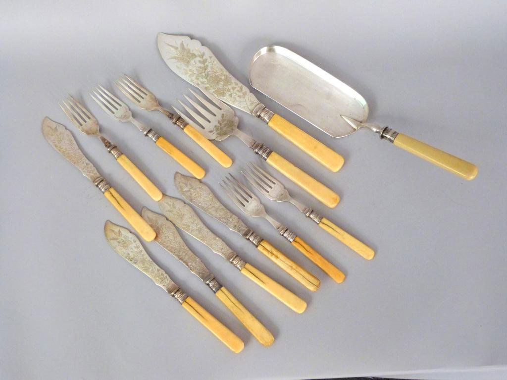 SoldCASED (26 PC) ENGLISH FISH SERVING SETEarly 20th c. (26) Piece Fish Cutlery Set, with sterling silver collars marked for Yates Brothers, Sheffield, 1908, ivorene handles, engraved silver-plate blades, incl: Fish slice, 11 1/8" long; ServiSee Sold Price