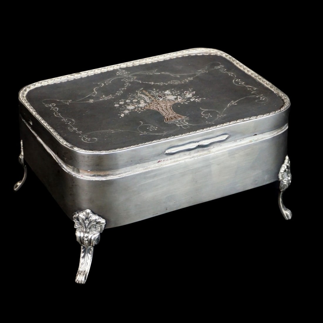 A SILVER 'DRAGON' BOX AND COVER, CHINA, LATE QING DYNASTYMar 11, 2026Vintage Silver Plate Jewelry BoxMar 10, 2026Antique SP Engraved with Dragons Hinged BoxMar 08, 2026English Art Deco sterling silver cigar/cigarette box by MAPPIN & WEBBMar 15, 2026Italian 925 Sterling Silver Floral Leaf Chased Spice Besamim Box3 days LeftSilverplated Dresser BoxMar 04, 2026Handmade 925 Sterling Silver Floral Snuff Spice Box BP-14392 days LeftA silver cigarette box,Vintage Celluloid Hard Plastic Asian Style Lidded Embossed Jewelry BoxJul 21, 2025Handmade 925 Sterling Silver Multi Floral Esrog Box 5.5 x 8 Inches4 days LeftSterling Silver Wood-Lined Cigarette Keepsake Box Art Deco Style England c.19413 days LeftAsprey Sterling Silver Engine Turned Cigarette or Cigar Box 1955Mar 15, 2026Japanese Silver Mounted Lacquer Wood Box Gold Inlay Meiji PeriodMar 15, 2026A YEMENI JEWISH SILVER FILIGREE BESAMIM SPICE BOXMar 06, 2026Silver Cigarette Box7 hrs LeftA WMF German Art Nouveau jewelry casket, circa 1905Mar 15, 2026
