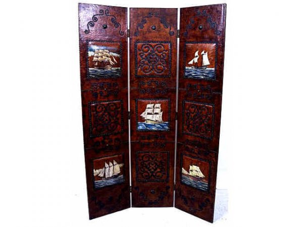 ENGLISH PAINTED TRI FOLD LEATHER DRESSING SCREEN