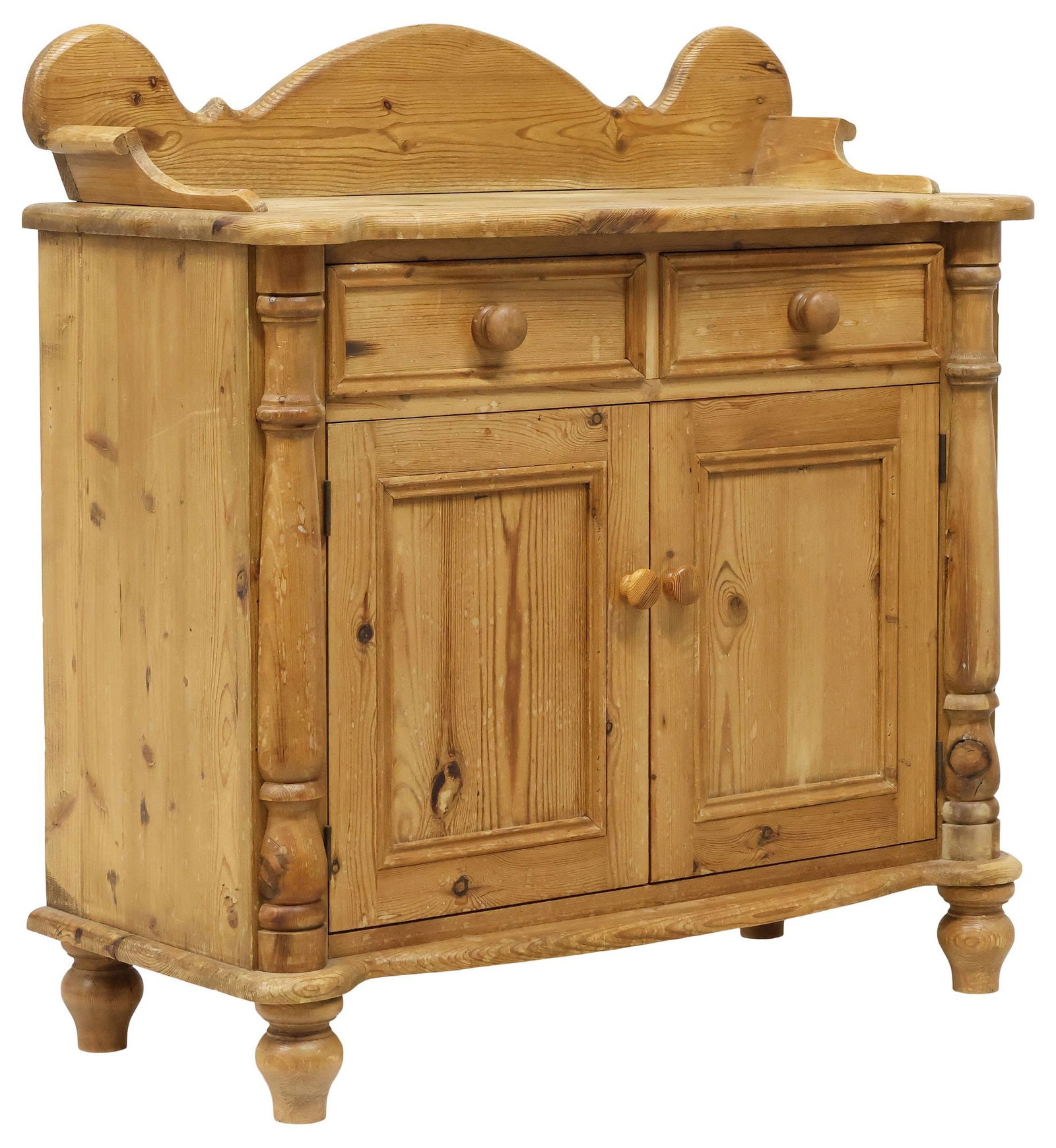 SoldEnglish Country Pine Water Table or Wash StandMid 19th century. Having a shaped back and side above square top with rounded edge above lower case resting atop turned tapering legs. H37" W23 1/2" D17" Sold from the collection of a Meeting St. ladySee Sold Price