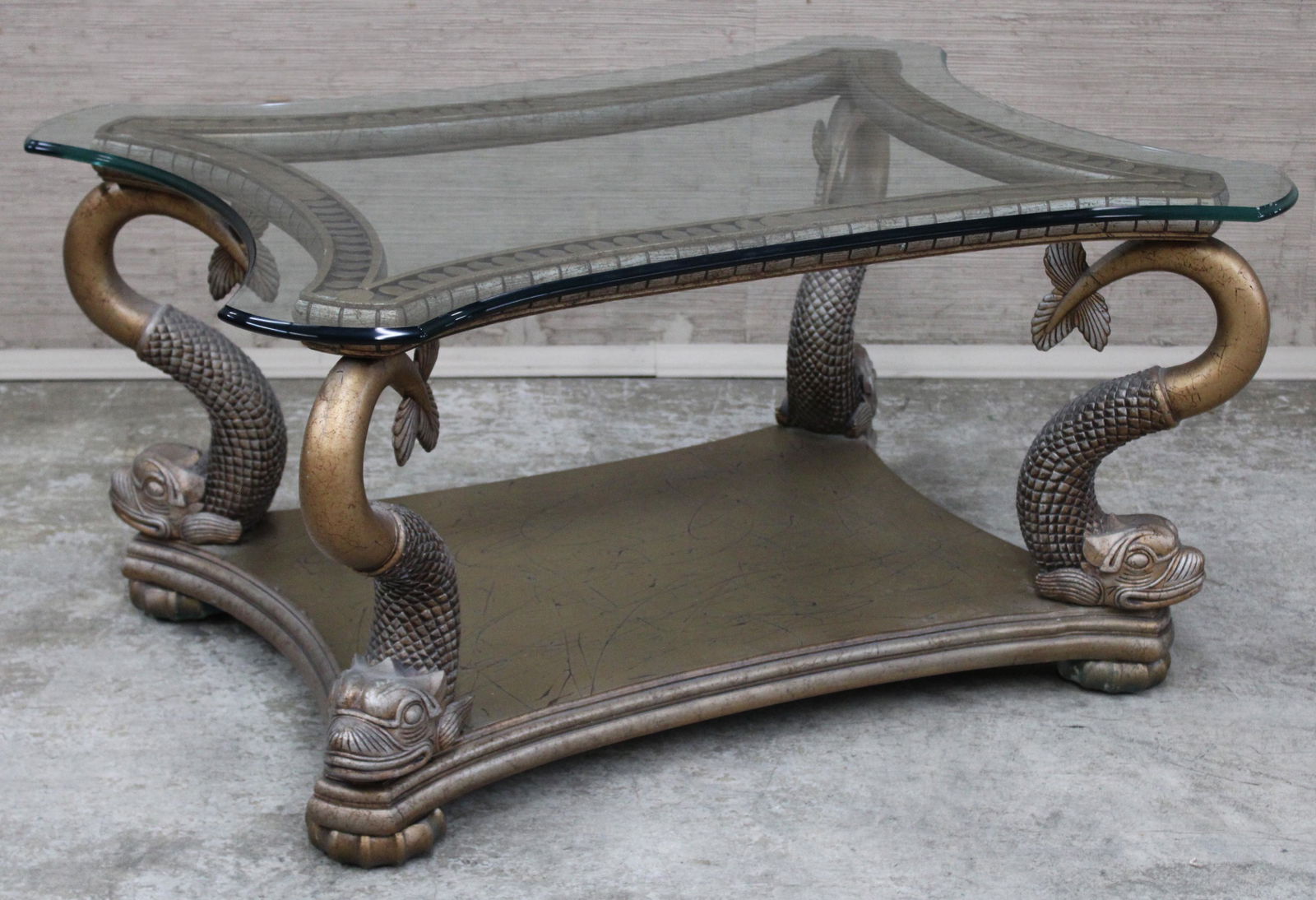SoldHollywood Regency Style Gilt Metal And Onyx TableHollywood Regency style gilt metal mounted onyx coffee table, the oval top supported by dolphin-form supports resting on the lower tier. 17.5” H x 46.75” W x 23” DSee Sold Price