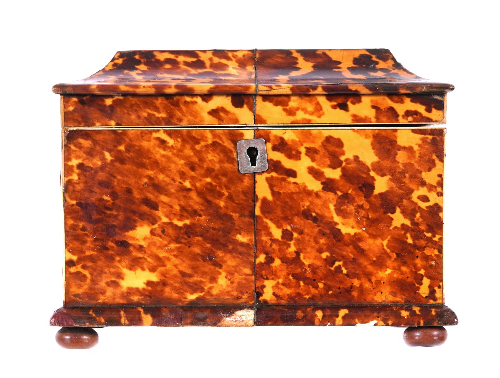 SoldEnglish Regency tortoise tea caddyAn early 19th century English Regency Period tortoise shell tea caddy. Serpentine form with hinged cover opening to fitted interior with two tortoise shell lids, on four bun-form feet. Fine cracks toSee Sold Price