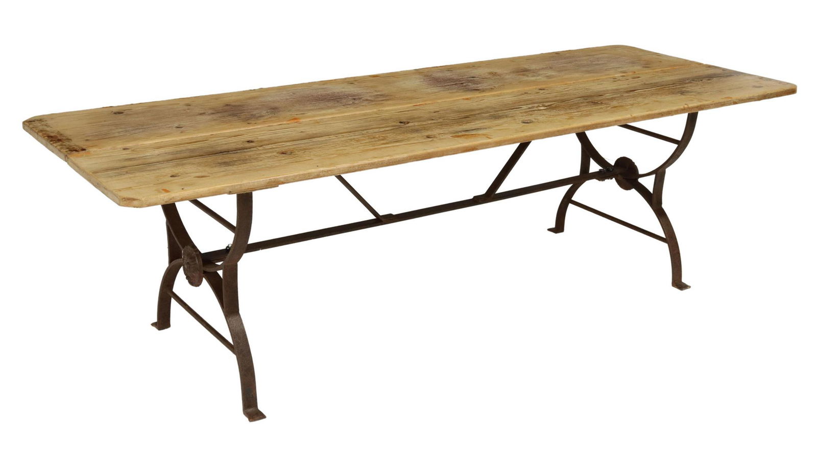 Jean Royere style French Industrial Modernist Iron Wood Coffee Table. Decorative iron grill form 3 SJean Royere style French Industrial Modernist Iron Wood Coffee Table. Decorative iron grill form 3 Sided Base supports Pine Top. Iron base has intentionally worn painted finish. Dimensions: Height: 20