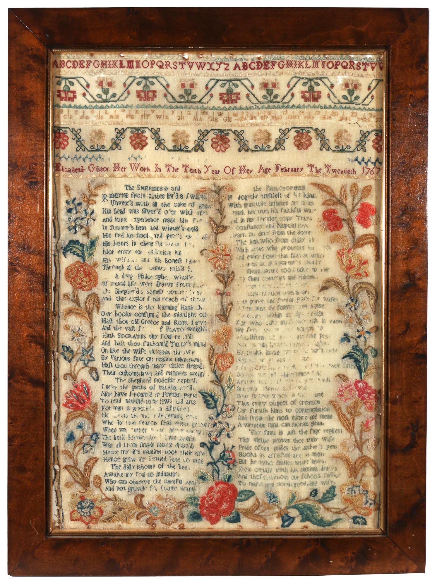 Y A REGENCY NORFOLK SAMPLER IN COMMEMORATION OF NELSON, WORKED 18207 days Left18th century silk embroidered sampler, possibly American. Decoration of columns flanking the Lord'sMar 01, 2026MARY ANN TILLEY ENGLISH NEEDLEWORK SAMPLER, EARLY 19TH CENTURYFeb 21, 2026SARAH M. LORD AMERICAN SAMPLER, DATED 1825Feb 21, 2026EARLY 19TH CENTURY AMERICAN PICTORIAL SAMPLER, CELIA LEACH, 1835Feb 22, 2026ANN TAPPAN AMERICAN NEEDLEWORK SAMPLER, DATED 1795Feb 21, 2026EARLY 19TH-C. FOLK ART NEEDLEWORK SAMPLERFeb 22, 2026DORCAS HAYNES ENGLISH SAMPLER, DATED 1717Feb 21, 2026Philadelphia Quaker Sampler - Margaret S. Knight, 181818 hrs LeftTWO 19TH C. NEEDLEWORK SAMPLERS.Feb 25, 2026FRAMED 18TH C. ENGLISH PICTORIAL SAMPLERFeb 21, 2026REBECCA SIMMONS AMERICAN NEEDLEWORK SAMPLER, DATED 1817Feb 21, 2026Circa 1805 Needlepoint Sampler Aged 11 Framed and MattedMar 07, 2026SARAH B. HOWLET ENGLISH NEEDLEWORK SAMPLER, DATED 1839Feb 21, 2026Sarah Cassat's Needlework Sampler, Instructed by Ann Peers, PennsylvaniaFeb 19, 2026Rare Plymouth, Massachusetts Needlework Sampler with Mt. Vernon ImageryFeb 25, 2026