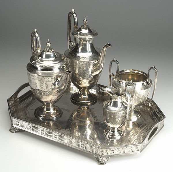 (5) ENGLISH ELKINGTON & CO. STERLING SILVER TEA & COFFEE SERVICE5 days LeftRococo Style Silver Plate Coffee And Tea Set (7-piece), C. Mid-late 20th CenturyFeb 26, 2026American Aesthetic Silver-Plate Four Piece Coffee Service, late 19th c., Coffee- H.- 12 1/4 in., W.-Feb 27, 2026Five-Piece Silverplate Tea and Coffee Service with Large Serving TrayMar 07, 2026Reed & Barton Baroque Silverplate Coffee ServiceFeb 27, 2026AN AMERICAN SILVER SEVEN-PIECE TEA AND COFFEE SERVICE AND TRAY MARK OF TIFFANY & CO., NEW YORK,2 days Left5 Pieces Preisner Sterling Silver Tea Set with a Large Oval English Sterling Silver TrayFeb 28, 2026Five-Piece Silverplate Tea and Coffee Service in the “King Francis" Pattern with TrayMar 07, 20266PC STERLING TEA SERVICE, INTERNATIONAL, 133 TOWMar 07, 202619th Century Six Pc. French Silver Tea and Coffee Service (~8,000grams)4 days Left(8 PCS) ENGLISH STERLING SILVER BEVERAGE SERVICE5 days LeftJames Dixon & Sons Silver Plate Coffee Service, 5Mar 07, 20261940s Silver Plate Coffee and Tea Service by F. B. Rogers - 4 Piece SetGerman Hand Chased Angkor .900 Silver Tea Service SetFeb 26, 2026SELECTION OF SILVER PLATE ITEMS, INCL. TEA AND CASTER SETS.2 days LeftSilver Plate Tea Set With Orientalist Motifs And Associated Tray (5-piece)Feb 26, 2026