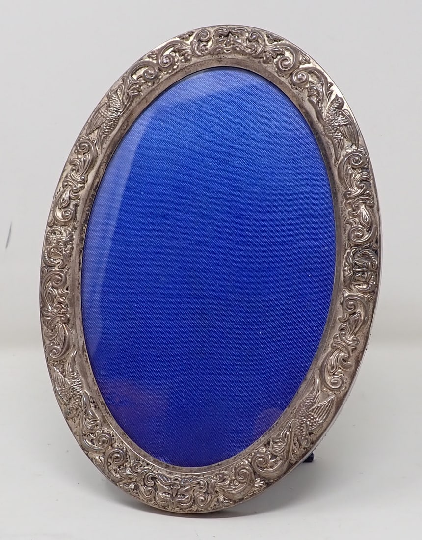 SoldAntique English Sterling Silver Picture FrameAntique English sterling silver repousse picture frame . Hallmarked. Size: 8 3/4" x 7" ( 22 x 18 cm ) full , 5" x 3 1/2" ( 12,5 x 9 cm ) opening . Condition: very good original, tarnished silver.See Sold Price