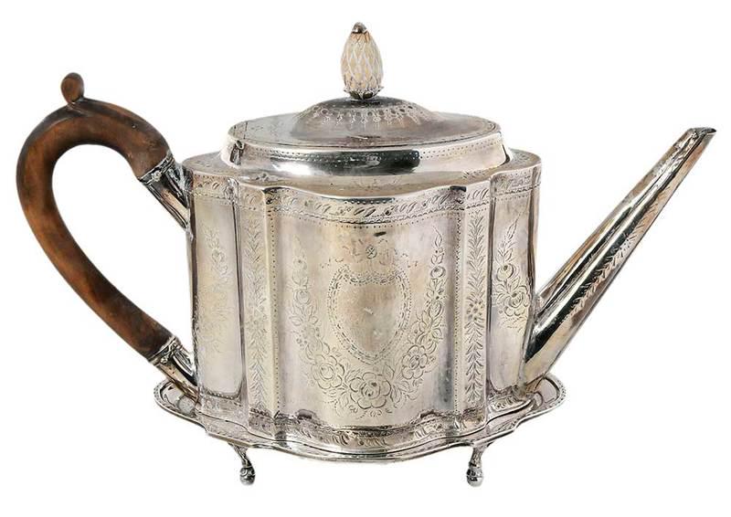 Early 19th century English sterling silver teapot. Engraved foliate scrollwork borders and draperyTremont Auctions4.6(313)$3005 days Left