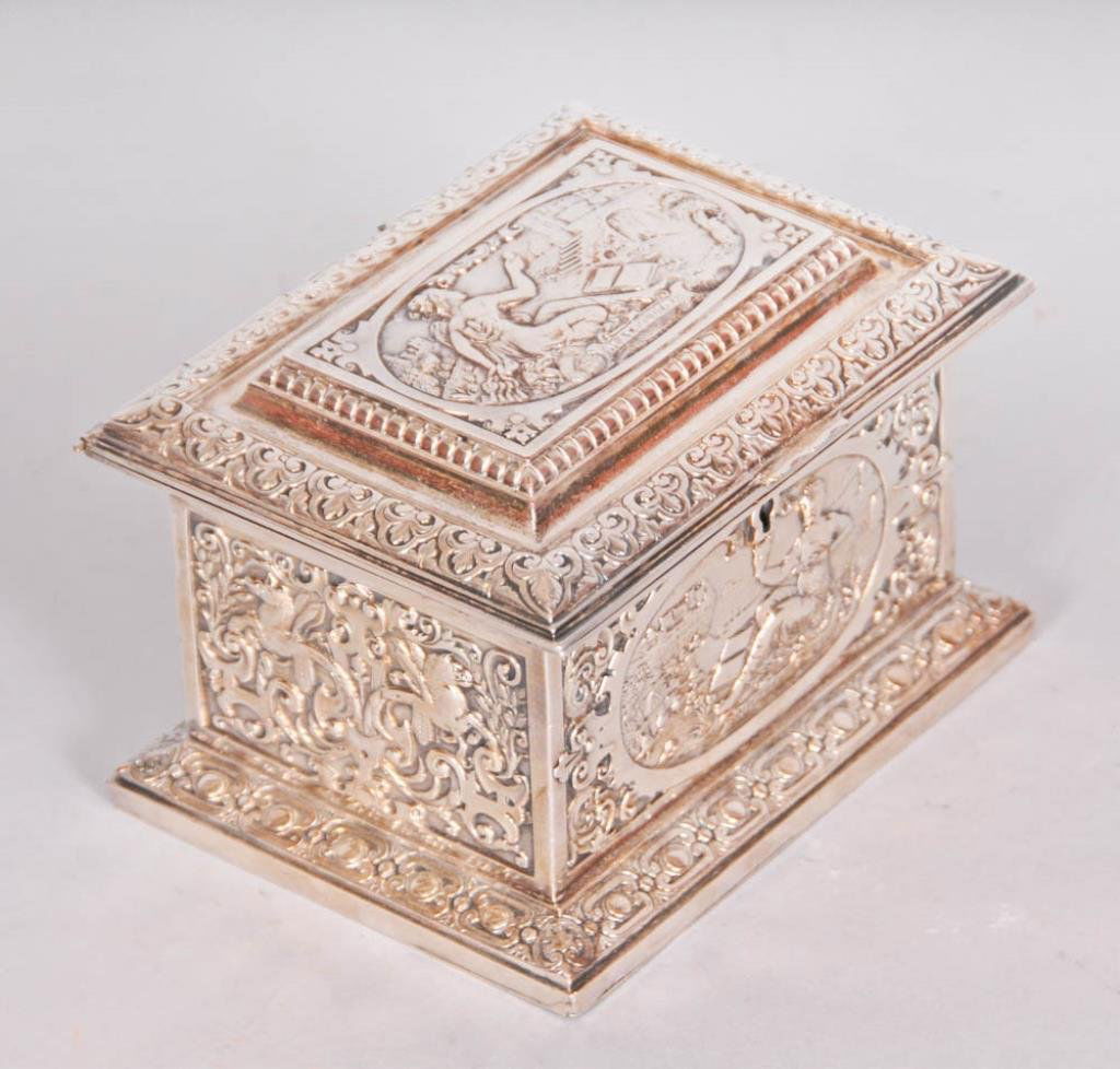 Vintage Silver Plate Jewelry BoxMar 10, 2026Belgian Brass Casket Box6 days LeftAntique Heavy Brass Medieval Style Casket Box with Decorative Friezes1 day LeftGorham Rococo Sterling Table Box3 days LeftA Precious Gilt-Bronze Silver White Jade-Inlaid 'Bird& Flower' BoxMar 06, 2026Silverplated Dresser BoxMar 04, 2026A YEMENI JEWISH SILVER FILIGREE BESAMIM SPICE BOXMar 06, 2026Silver Relief Square Lidded Jar with Figure Story Pattern2 days LeftBronze Jewelry Casket with Cherub BustsMar 07, 2026A silver cigarette box, 20th century,Antique Continental Silver Cherub & Insect .863 Fine Silver Trinket BoxFeb 28, 2026Qajar Silver and Silver-Gilt Cigarette Box, PersiaMar 15, 2026A WMF German Art Nouveau jewelry casket, circa 1905Mar 15, 2026A Ming Dynasty silver-gilt inlaid jade incense boxFeb 28, 2026Silver Cigarette Box5 days LeftFRENCH ORMOLU-MOUNTED & LACQUERED JEWELRY CASKET / VANITY BOX2 days Left