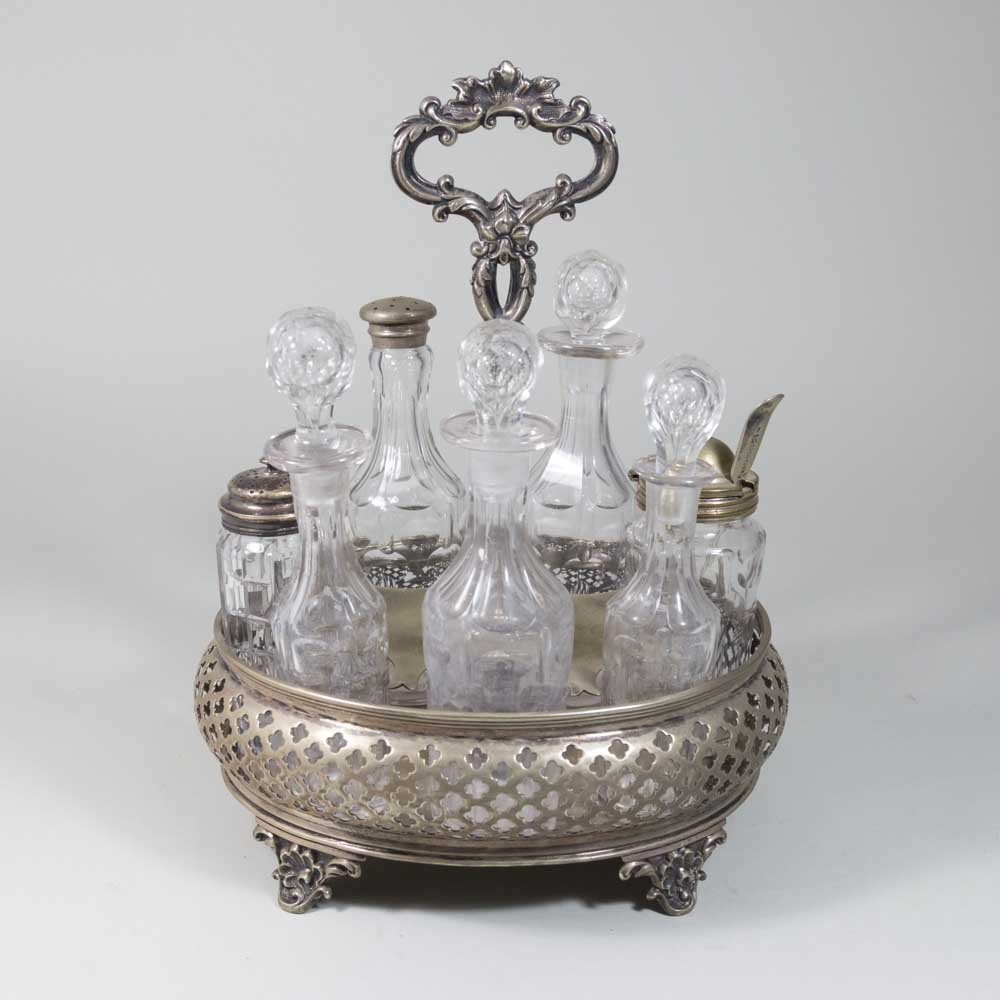 Pair of Fine Vintage Silver Collared Cut Glass DecantersVICTORIAN SILVER PLATE AND CUT GLASS CRUET SET.3 days LeftVictorian Sterling Silver Glass Cruet Set by Joseph & John Angell 1831397 Lots AwayAntique Wilcox SilverPlate Co Etched 5 Piece Cruet SetMar 07, 2026Antique Victorian Silverplate Etched Glass Condiment Cruet SetMar 07, 2026Elegant 7 Piece Silverplate Cruet Set with Footed Caddy and 6 Glass Bottles6 days LeftA FANCY ENGLISH SILVERPLATE TANTALUS6 days LeftA GEORGE III SILVER WARWICK CRUET20 hrs LeftVictorian Silverplate Cruet Stand SetFeb 28, 2026Reed & Barton Silver Plated Revolving Cruet SetMar 01, 2026Antique 5 Piece Cruet SetMar 07, 2026French Silver & Crystal Cruet Set4 days Left13 pc Sterling Silver Bowl, Cup, Shakers & TraysFeb 28, 2026DANIEL & ARTER 1900 London, Bailey Banks & Biddle 6 Pieces Cruet Set Cut Glass2 days LeftSilver Plated Cruet Set by Thomas Bradburn & SonsFeb 26, 2026Vintage Silver-Plated Pressed Glass Diamond Point1 day Left
