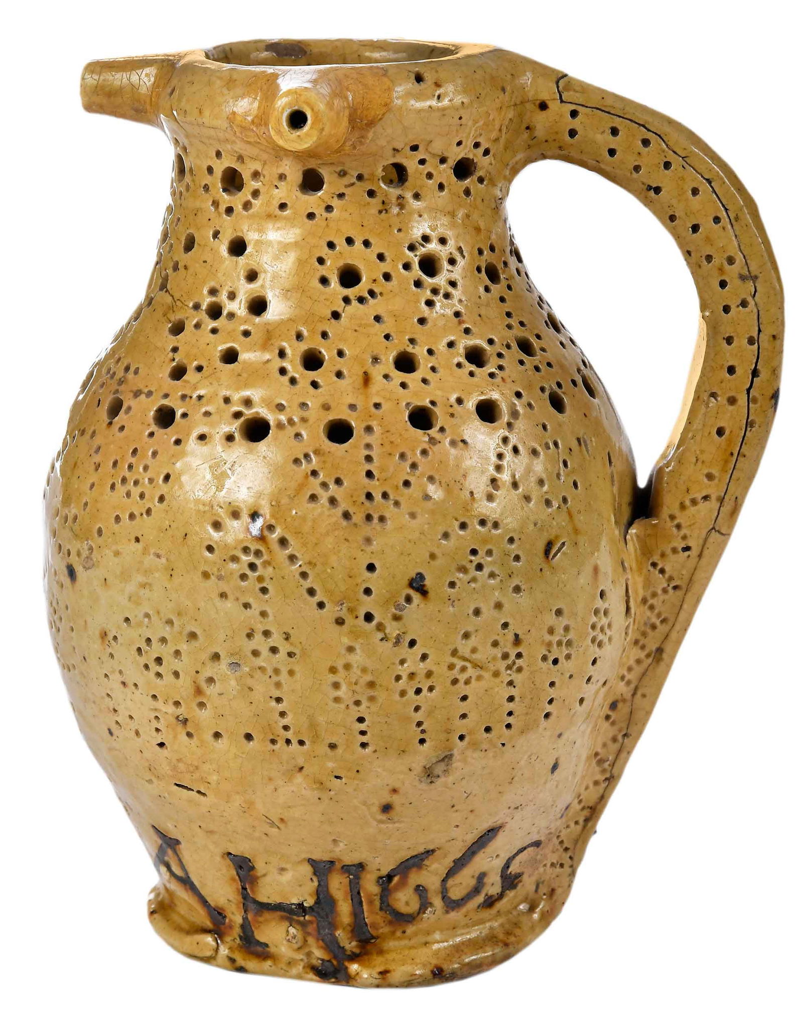 English Slipware Dated 1665 and Initialed Puzzle Jug
