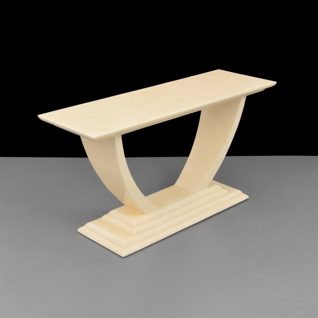 KARL SPRINGER-STYLE Custom Console Tablecirca 1970lacquered linen, wood, unmarkedheight 32 1/4in...PARCHMENT COVERED CONSOLE TABLE IN THE MANNER OF JEAN-MICHEL FRANK HAVING WATERFALL EDGES.Mar 25, 2026Enrico and Mario Bellotti (20th c6 days LeftJay Spectre Modernist Black & White Lacquer Wood MCM Console Table After DeskeyMar 29, 2026Style of Jean-Michel Frank 'Waterfall' Console TableMattaliano, USAVintage Coastal Console Table Pencil Reed Wave Style Betty CobonpueMar 15, 2026Toni Cordero (1937-2001) Console table Steel and travertine Model created circa 1972 H 73× W6 days LeftVintage Art Deco Jimeco Dining Table with Tessellated Bone FinishMar 20, 2026Axel Einar Hjorth, attribution, Extension dining table6 hrs LeftJohn-Richard Leili Console Table 38.25H 60W 18.25D NewMar 22, 2026Oliver Home Egret Console Table 32H 54W 13D Stylish DesignMar 20, 2026Currey Demi Collection Bheslana Marble Console TableMar 22, 20261980s Karl Springer Inspired White Grass Cloth Coffee Table24 hrs LeftMarble Style Console Table5 hrs LeftGrey & White Bone Inlaid Waterfall Coffee Table4 days LeftVintage Coastal Rattan Waterfall Console Table 60" WMar 14, 2026