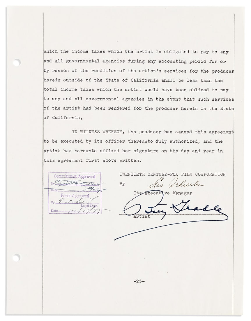(ENTERTAINERS.) GRABLE, BETTY. Two Typed Documents Signed, three-year studio contract