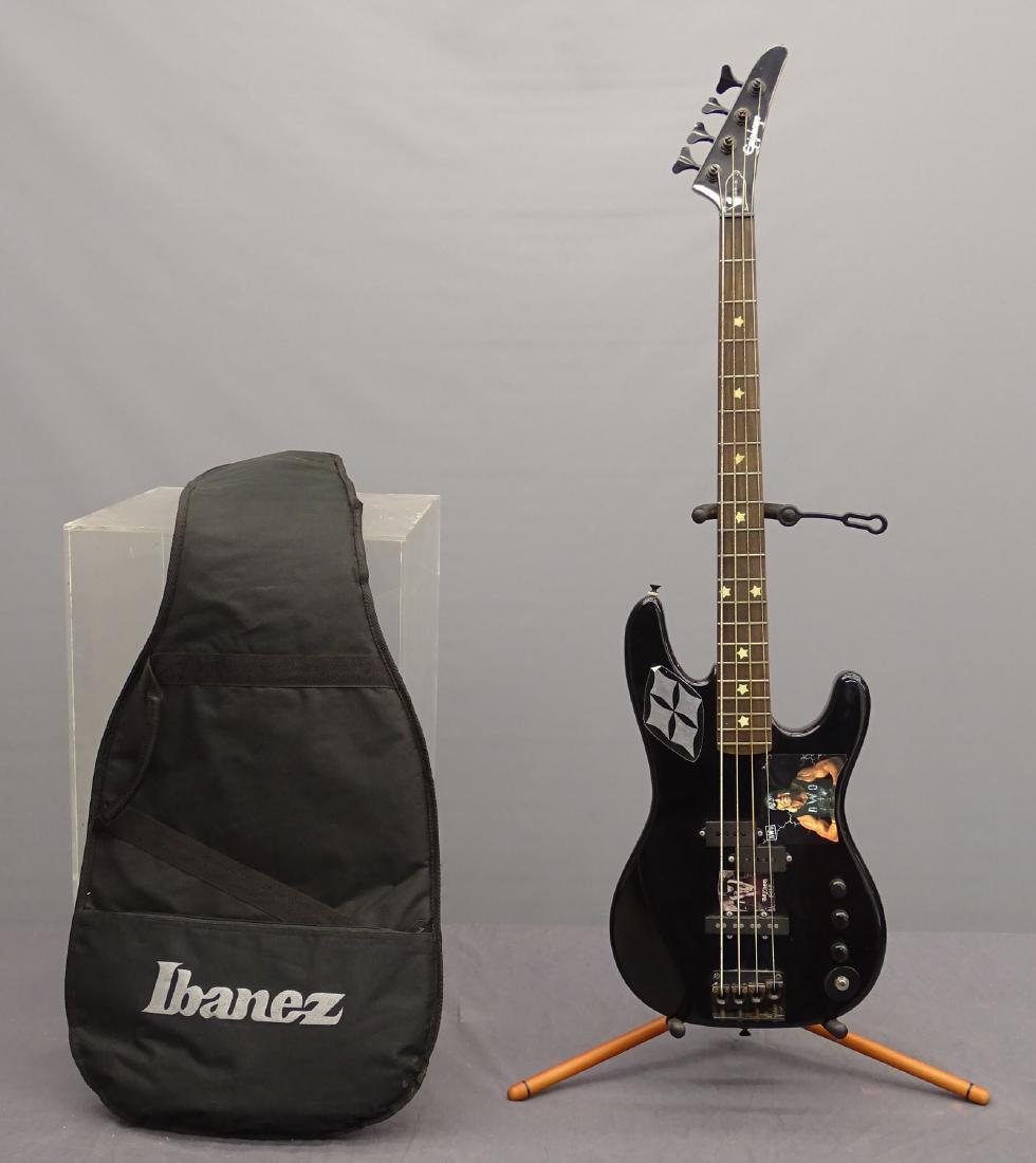SoldEPIPHONE BASE ACOUSTIC GUITAR w CASE & CableSIGNED Epiphone ACCU-BASS-JR Bass Guitars in black and gold, maple wood neck. The Alder body and split-coil humbucker deliver a classic, punchy sound that's great for practically every style of music.See Sold Price
