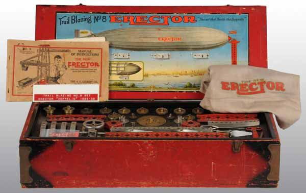 SoldGILBERT 8 ERECTOR SETfrom 1929, builds Zeppelin, orig label & advertisement, w/repro cloth zeppelin skin, complete, orig box worn, C7-8.See Sold Price