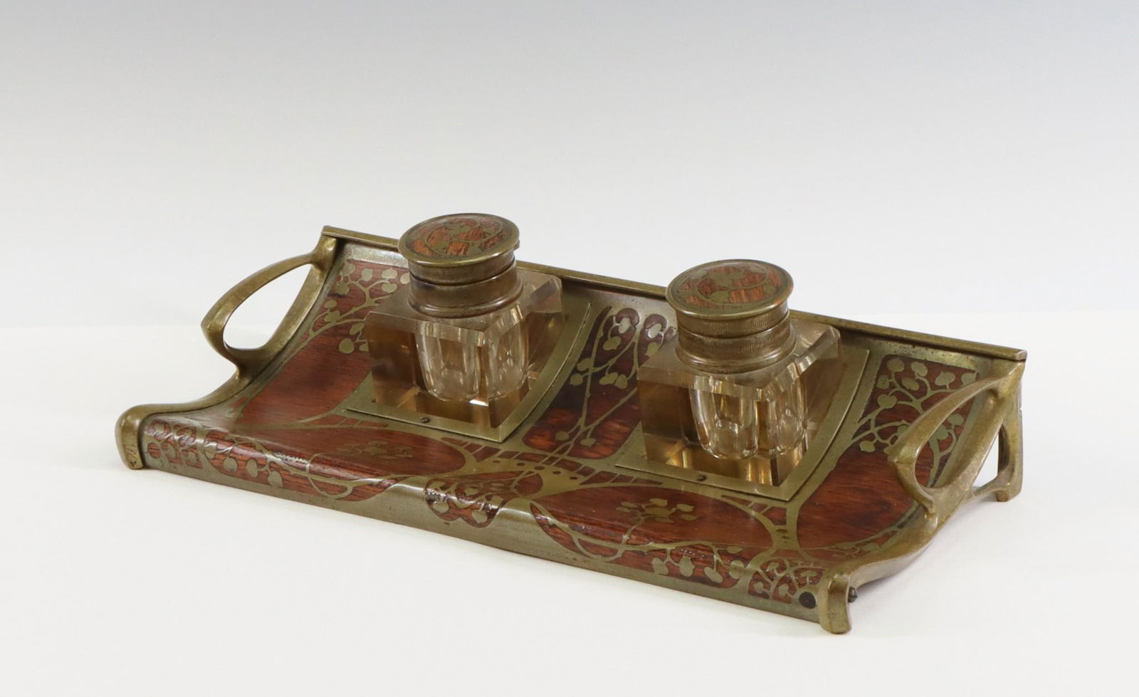 Sold1900 GERMAN ART NOUVEAU ERHARD AND SOHNE INK STANDAn exceptional antique German Jugendstil ink stand or pen tray with inkwell by Erhard and Sohne. The ink stand is of rectangular form, made of rosewood with elaborate brass inlays. The cylindrical inkSee Sold Price