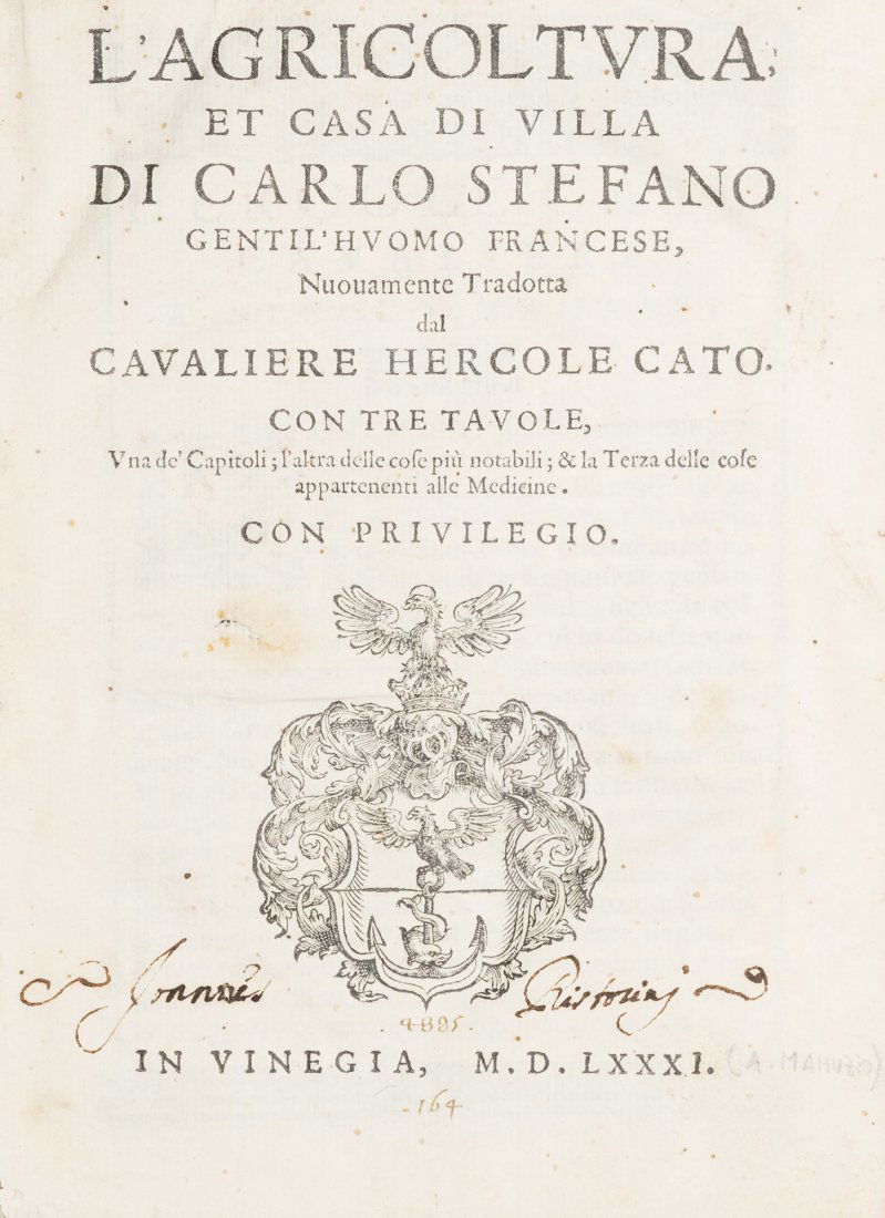 SoldESTIENNE; LIEBAULT. Maison RustiqueESTIENNE, Charles; LIEBAULT, Jean. Maison Rustique, or The Country Farme. London: Printed by Arnold Hatfield for John Norton and John Bill, 1606. 4 to, vellum. First 8 leaves have beenrestored with tiSee Sold Price
