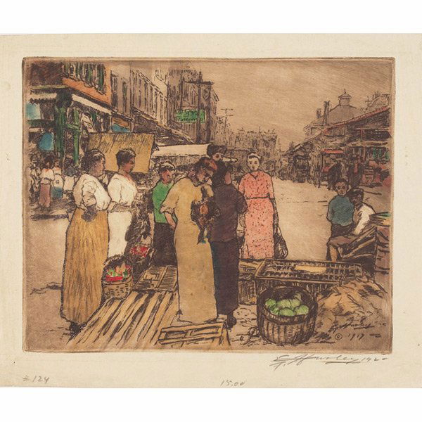 E.T. Hurley etching, market scene
